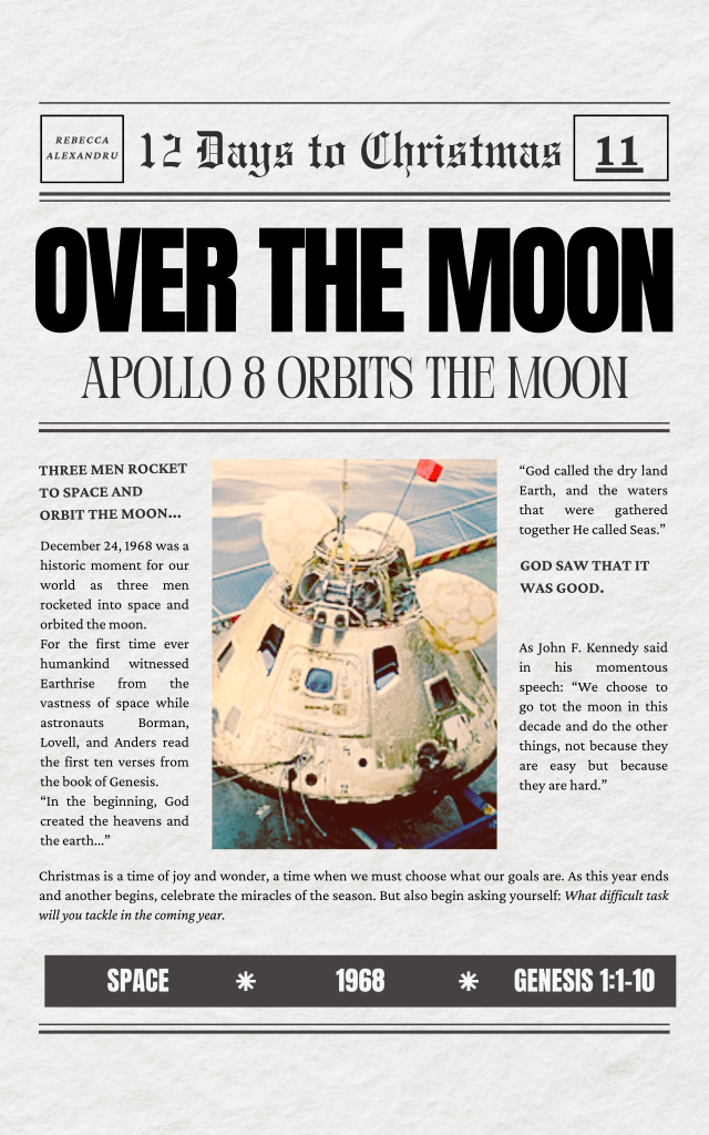 1968 – Apollo 8 Orbits the Moon Posted byRebecca AlexandruSeptember 22, 2024Posted inUncategorized Share this: Click to share on X (Opens in new window) X Click to share on Facebook (Opens in new window) Facebook Like Loading... Related