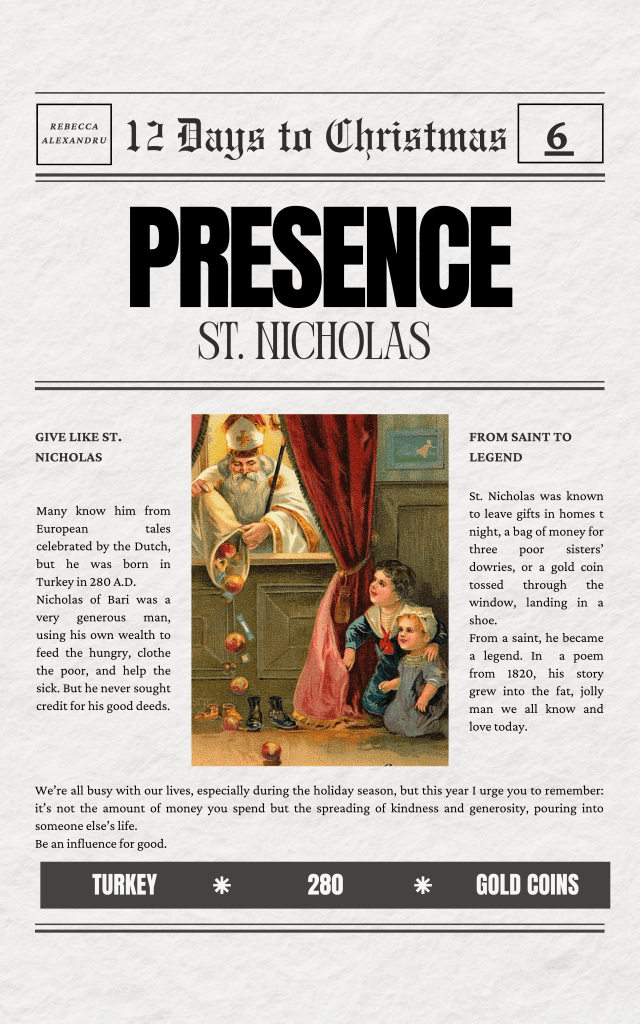 280: St. Nicholas Posted byRebecca AlexandruOctober 21, 2024Posted inUncategorizedTags:12 Days to Christmas, 280AD, book, books, CHristmas, December 25, gold coins, history, Holidays, Nicholas of Bari, Presents, St. Nicholas, vintage Share this: Click to share on X (Opens in new window) X Click to share on Facebook (Opens in new window) Facebook Like Loading... Related