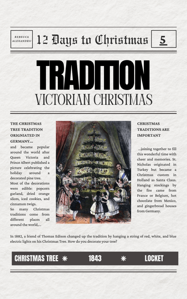 1848: Victorian Christmas Posted byRebecca AlexandruOctober 28, 2024Posted inUncategorizedTags:12 Days to Christmas, book, CHristmas, history, Holidays, Rebecca Alexandru, tradition, victorian, vintage Share this: Click to share on X (Opens in new window) X Click to share on Facebook (Opens in new window) Facebook Like Loading... Related